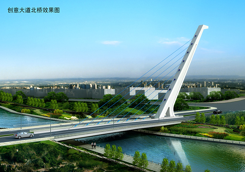 匯智橋路南、北橋均為無(wú)背索獨(dú)塔單索面斜拉橋,橋跨 82 米,全寬 33.5 米;智力島路橋?yàn)閱慰缧滦托笨渴焦?/span>